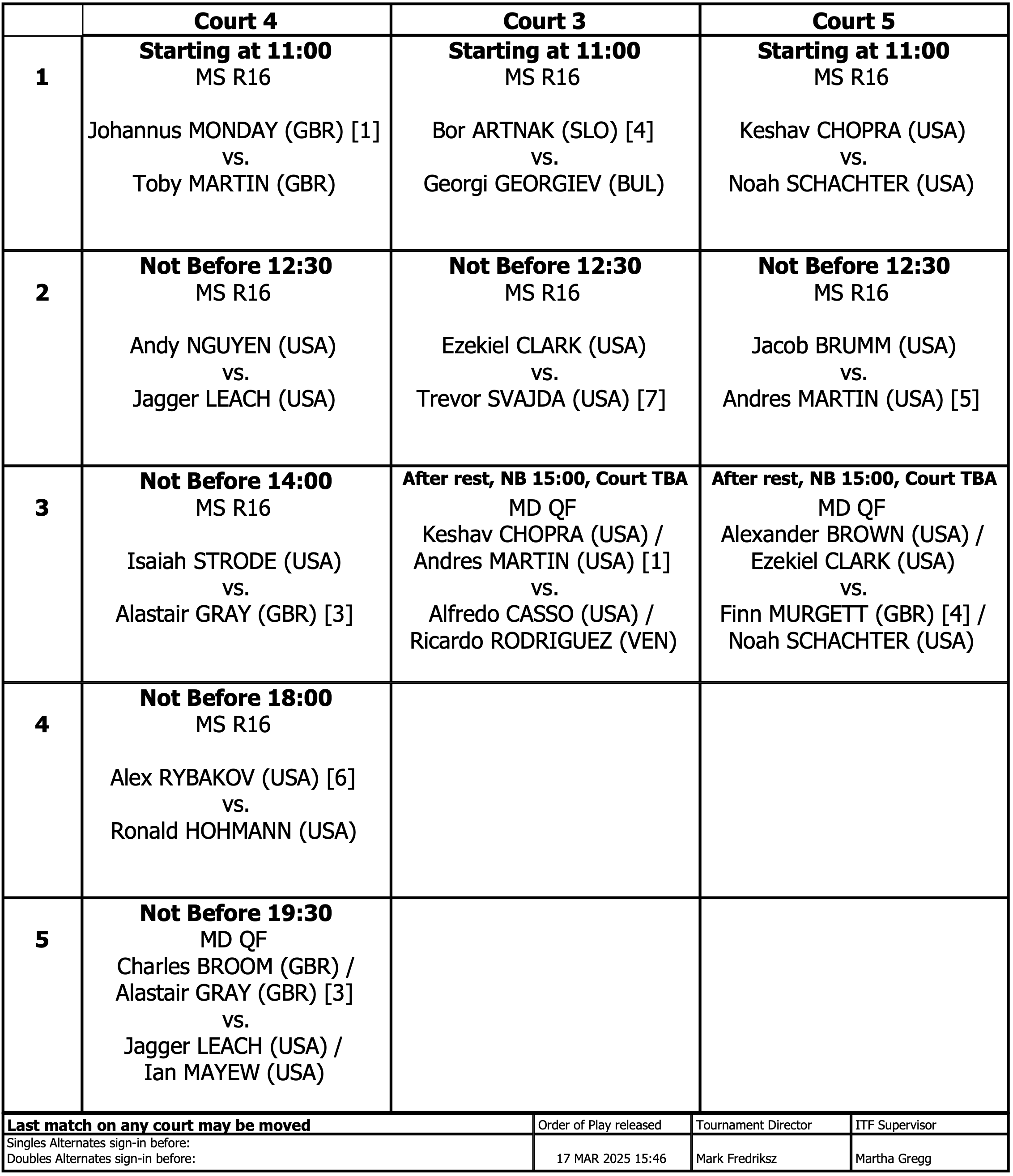 « All Events This event has passed. 2025 Main Draw Day 3 March 20 @ 11:00 AM - 5:00 PM « 2025 KCTA Awards & High School Team Night 2025 Thursday Singles and Doubles Featured » Singles and Doubles Main Draw continues, play begins at 11AM. 2025 Singles Main Draw 2025 Doubles Main Draw Add to calendar Google Calendar iCalendar Outlook 365 Outlook Live Details Date: March 20 Time: 11:00 AM - 5:00 PM Event Categories: Doubles, Singles, USTA Pro Circuit Venue Bakersfield Racquet Club 1660 Pine Street Bakersfield, CA 93301 United States + Google Map Phone (661) 325-8652 View Venue Website