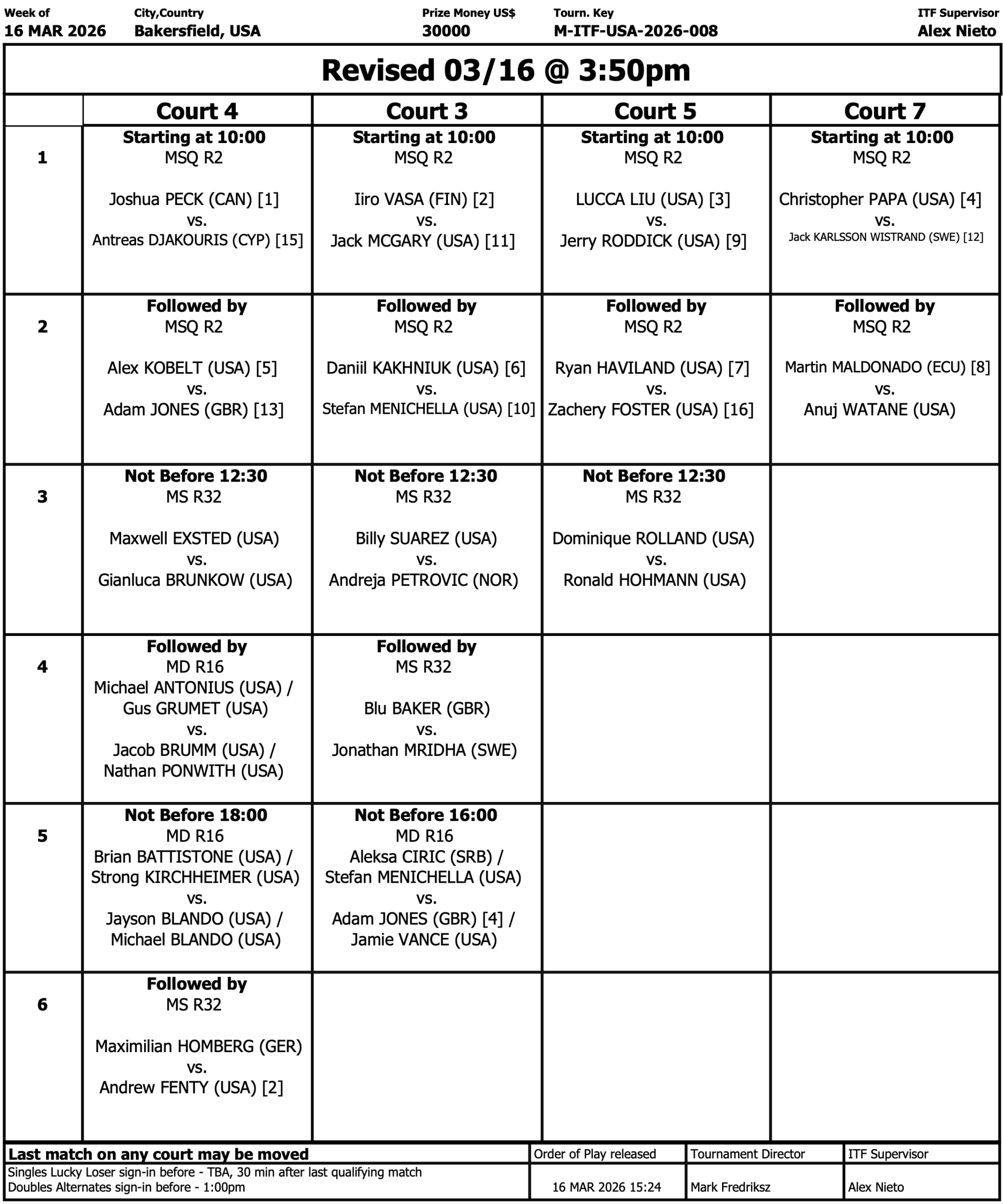 Singles Main Draw begins upon completion of the Qualifier, order of play as follows.
